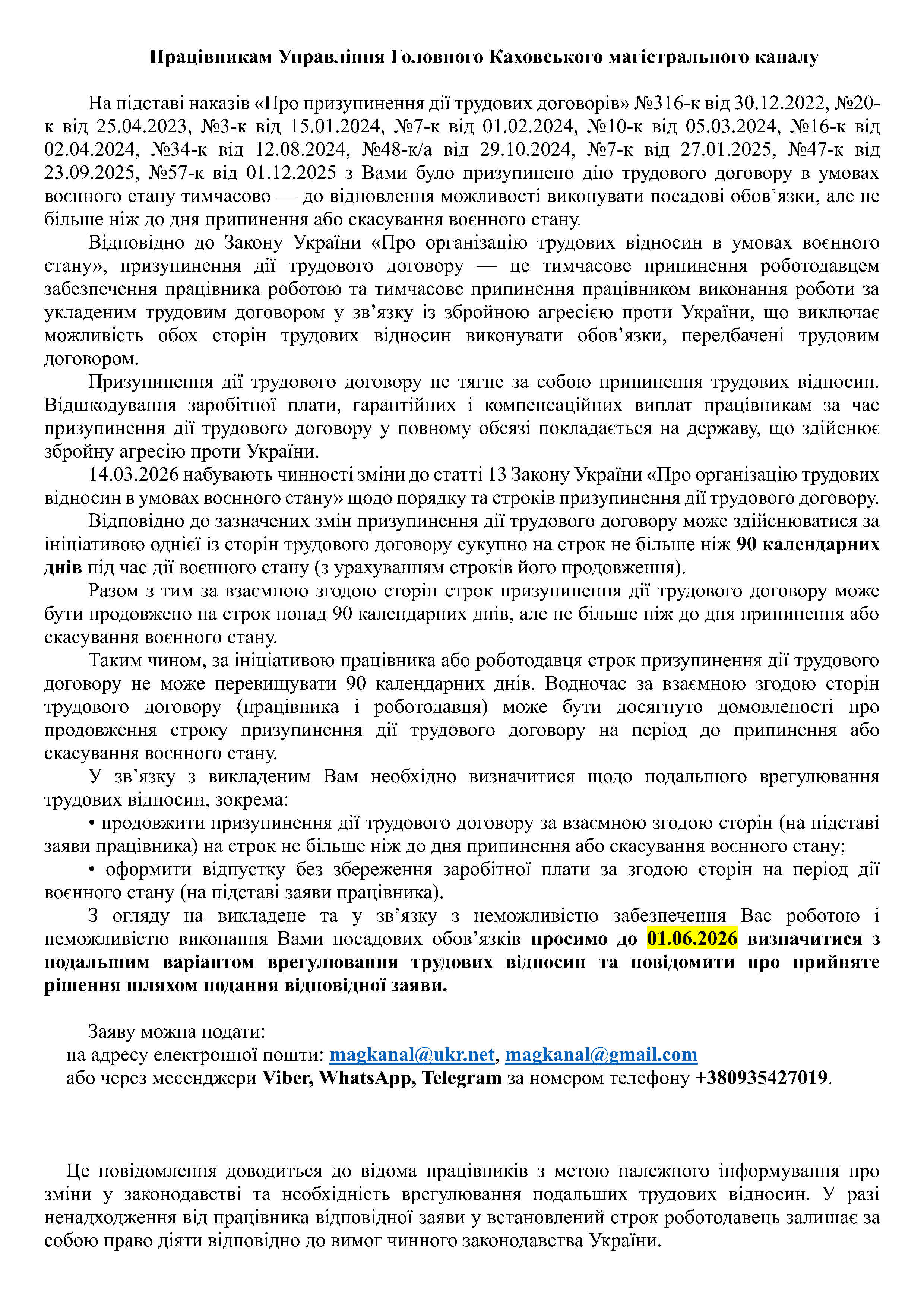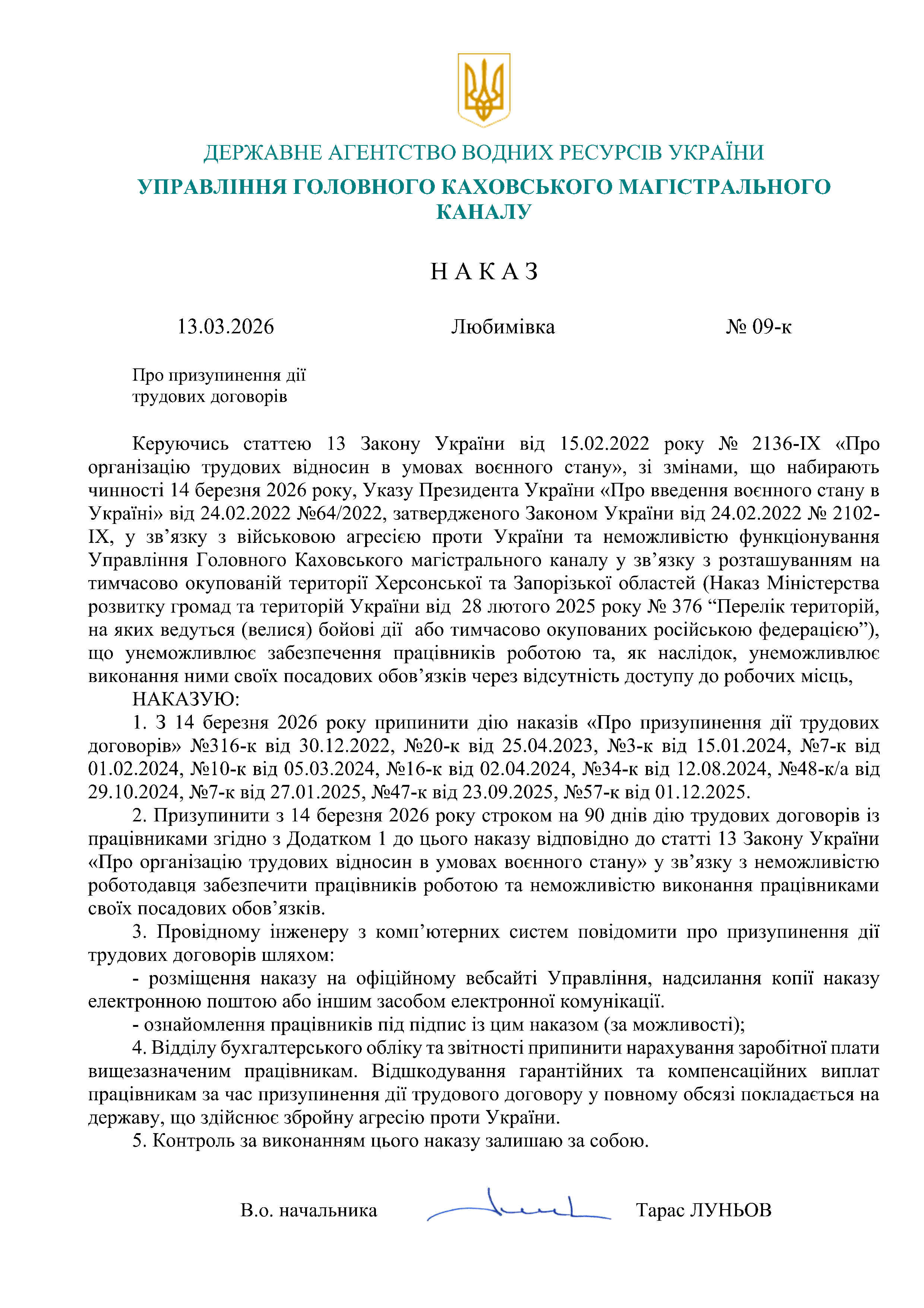 Відповідно до ст. 13 Закону України "Про організацію трудових відносин в умовах воєнного стану" від 15.03.2022 № 2136-IX, Указу Президента України "Про введення воєнного стану в Україні" від 24.02.2022 № 64/2022, затвердженого Законом України від 24.02.2022 № 2102-IX, у зв'язку з військовою агресією проти України та неможливістю функціонування Управління Головного Каховського магістрального каналу.